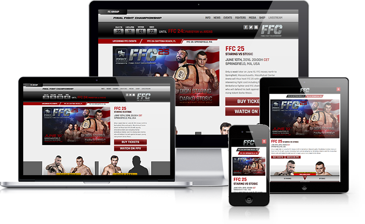 Final Fight Championship (FFC) je jedna od vodećih europskih borilačkih promocija. Klijent je bio zadužen za grafički dizajn desktop verzije web stranica, a M-BIT je bio zadužen za konverziju u HTML/CSS, kreiranje responsive (mobile-friendly) verzije, dosta PHP programiranja, uključujući kreiranje specifičnih pluginova za upravljanje profilima boraca, borbama, statistikom itd…